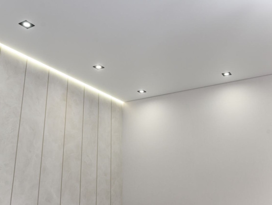 Парящие. Установка таких композиций также эффективна в комнатах с небольшой высотой. В конструкцию встроен специальный профиль со скрытой светодиодной лентой. При включении освещения полотно будто «парит».