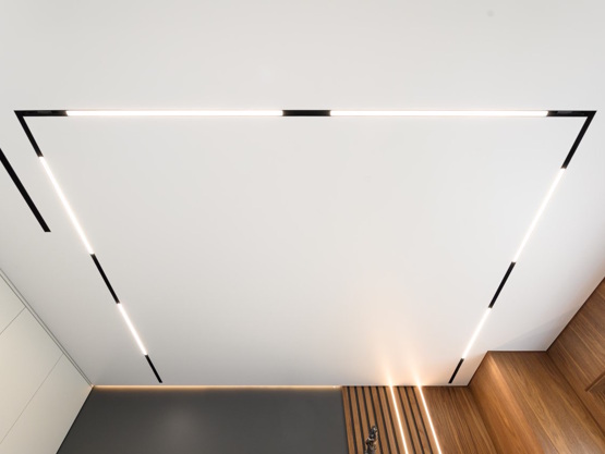 Светодиодная лента укладывается в него вдоль стены, затем натягивается пленка ПВХ или ткань, после чего лампочки закрываются специальной пластиковой заглушкой, рассеивающей свет. Именно благодаря оптическому эффекту и полупрозрачности профиля мы видим не отдельные огоньки, но матовое свечение по всему периметру потолка.